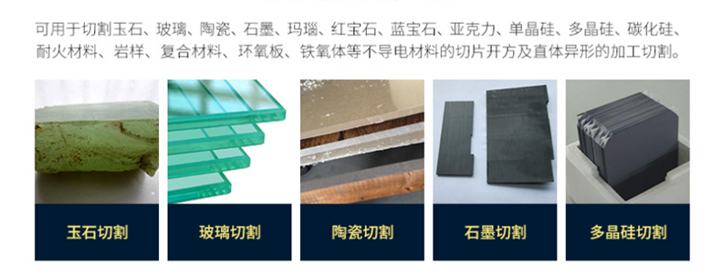 可用于切割玉石、玻璃、陶瓷、石墨、瑪瑙、紅寶石、藍(lán)寶石、亞克力、單晶硅、多晶硅、碳化硅、耐火材料、巖樣、復(fù)合材料、環(huán)氧板、鐵氧體等不導(dǎo)電材料的切片開(kāi)方及直體異形的加工切割